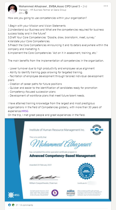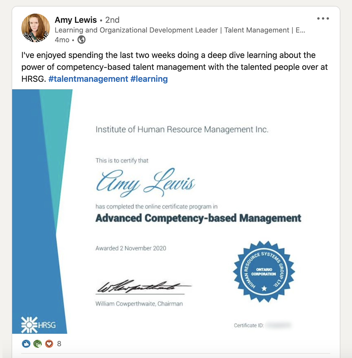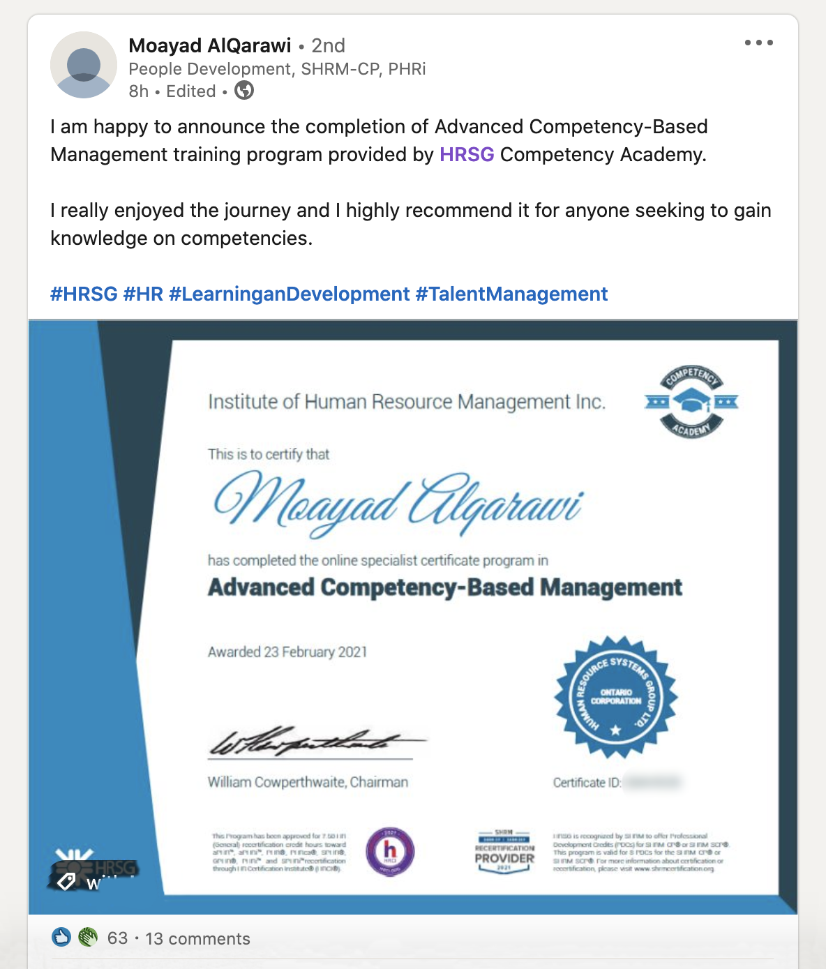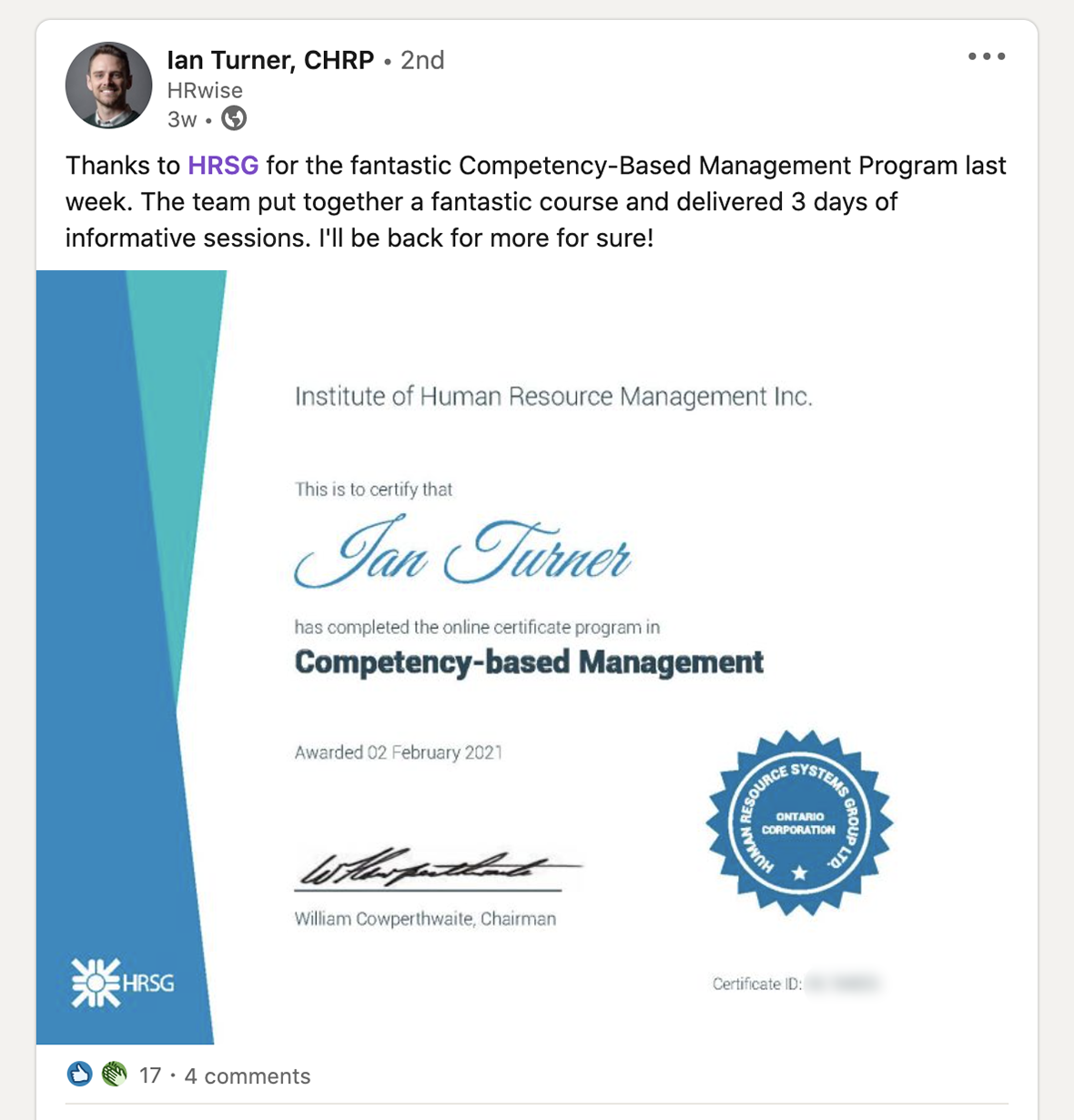 HRSG’s Competency-Based Management Certificate is an internationally recognized program and has been delivered to hundreds of professionals globally. Upon completion, you will be an accredited Competency-Based Management Professional and a certificate will be issued to you.